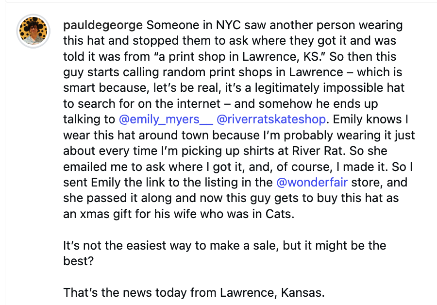 One day I saw my friend Jeff wearing a Cats hat and a cartoon lightbulb went off over my head and I thought, "What if the C was an H." I went home and after spending 10 minutes in Photoshop, I put in an order for 50 hats. When they arrived, Meredith was sure I'd never sell that many, but here we are almost a decade later and we're well into our fourth printing. It's a hat that is difficult to find on the internet, so congrats for working your way here. People with a really excellent sense of humor usually purchase this hat. Folks compliment me on it all the time, so if you want people telling you they like your hat, then this is a hat that will make that happen for you. -Paul DeGeorge, Wonder Fair co-owner